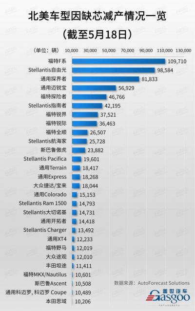 5月24日,全球汽车咨询机构AutoForecast Solutions发布了一份北美各车企和车型减产评估报告。根据该报告,截至5月18日,13家汽车制造商在北美共减产1,074,397辆汽车,其中,底特律三巨头通用、福特和Stellantis(包括菲亚特克莱斯勒)“稳”居前三,受到重创。