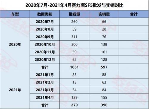 根据车经社掌握的实销数据显示,整个2020年,赛力斯SF5实际销量为597辆;今年前4月,赛力斯SF5实际销量为390辆。也就是说,利用赛力斯的自有销售渠道,赛力斯SF5上市10个月以来的实际销售仅有987辆。