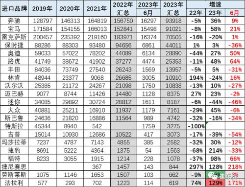 数据显示,我国进口的豪华车占比已从2019年的78%上升至2023年的91.6%,进口超豪华车占比保持稳定。分品牌看,近年来奔驰、宝马进口车销量份额持续增长,奔驰2023年已成为进口车品牌第一,其上半年进口车累计销售93918辆,同比增长36%;宝马销售91021辆,同比增长58%;雷克萨斯销售70505辆,同比下降20%。