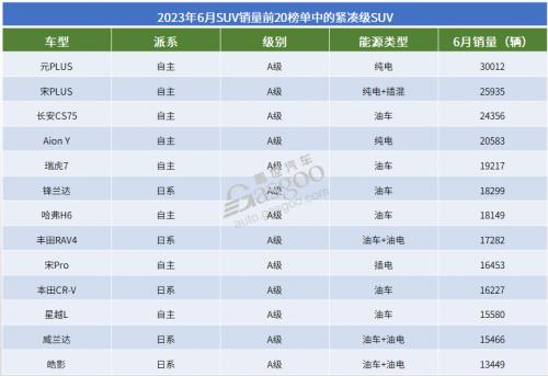 国内紧凑级SUV市场,早已经是自主车的天下,上榜6月SUV市场销量前20的紧凑级车型共计13款,这其中有8款都是自主产品,而且销量最高的5款紧凑级SUV,都是自主车型。合资紧凑级SUV中,日系车的优势依旧明显,6月有5款合资紧凑级SUV跻身了SUV销量前20榜单,5款车全是日系产品。