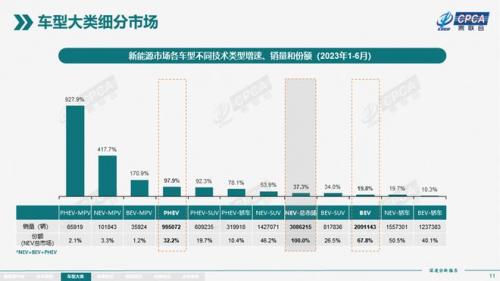 值得关注的是,2023年上半年新能源汽车中混动车型的销量增速明显要快于纯电车型增速。从数据可以看到混动车型整体增速依然接近翻倍,达到了97.9%,反观纯电车型仅有19.8%的增速,增速大大放缓了。这也就阐述了为何像零跑这样的车企,只下调了纯电车型的售价,混动车型售价却依然坚挺。