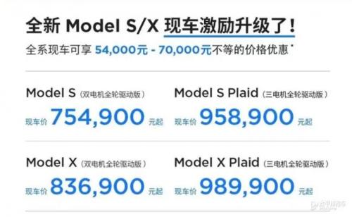 之后特斯拉中国又针对Model S/X现车再次下调价格,Model S现车75.49万元起售,Model X现车83.69万元起售,优惠幅度最高达到7万元,还有3年/6年免费超充、引荐奖励、FSD限时转移等权益,优惠幅度可以说是超乎想象。