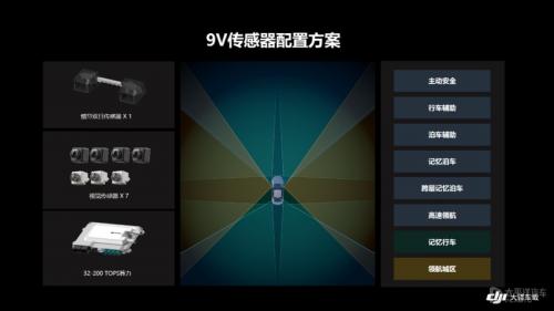 “成行平台”目前有7V(1个惯导双目+5个摄像头,算力兼容32-100TOPS)和9V(1个贯导双目+7个摄像头,算力兼容32-200TOPS)两种方案,是很明显的重算法、轻硬件的路线。7V方案采用一对前视惯导立体双目摄像头、四颗环视鱼眼摄像头和一颗后视单目摄像头,可以实现主动安全、记忆泊车、跨层记忆泊车、记忆行车和高速领航等功能。而9V方案则多增加了两颗侧向感知摄像头,提升了城区拐弯和侧向的感知能力,对应也新增了领航城区功能。功能方面和目前第一梯队的蔚小理华相比,丰富度差别不大,包括停车场记忆泊车、城区+高速的无图领航等,不过传感器要少了很多,只能说“成行平台”将硬件压缩到了极致,实现最大程度的硬件复用。