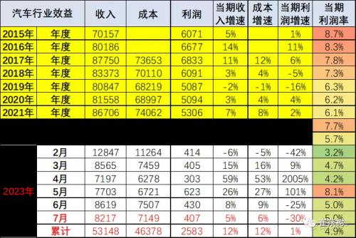 日前,乘联会秘书长崔东树公布了汽车行业最新整体营收情况。数据显示,2023年7月,汽车行业收入8217亿元,同比增长5%;利润407亿元,同比下降30%,汽车行业利润率5.0%。