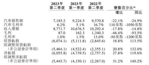 在毛利率方面,蔚来二季度毛利率为1.0%,2023年一季度为1.5%,2022年同期为13%。其中二季度汽车毛利率为6.2%,2023年一季度为5.1%,2022年同期为16.7%。