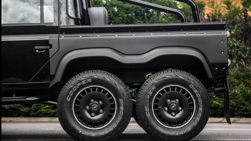 与传统的四驱车相比,这台路虎6x6皮卡车多了一套额外的传动轴,以驱动另外的两个轮子。同时,升级的防滑板可保护底座,延长的轮拱为越野轮胎提供更多间隙。