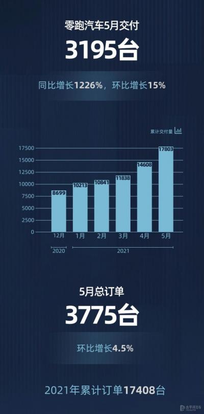 6月1日,我们从零跑官方处获悉,零跑5月交付新车3195台,同比增长1226%,环比增长15%,累计交付新车17803台;5月订单3775台,环比增长4.5%,2021年度累计订单17408台。
