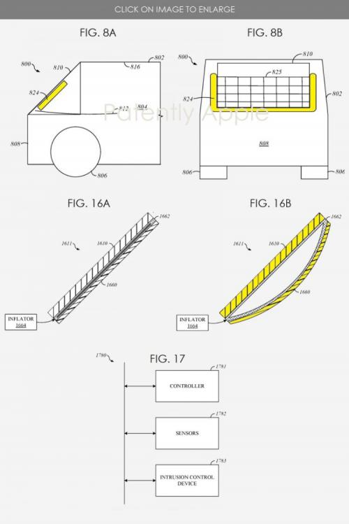 苹果的专利装置包括位于挡风玻璃外围的面板外壳,以及可展开面板。系统检测到即将发生冲击时,该面板会展开,以覆盖部分挡风玻璃。该装置还包括可破碎结构,随着挡风玻璃横向延伸,以及阻止结构,横向延伸到挡风玻璃上,从而阻止车辆前部变形。此外,该装置还包括仪表板,该仪表板部分由可压缩结构形成,在撞击过程中,该结构与挡风玻璃啮合并被压缩。