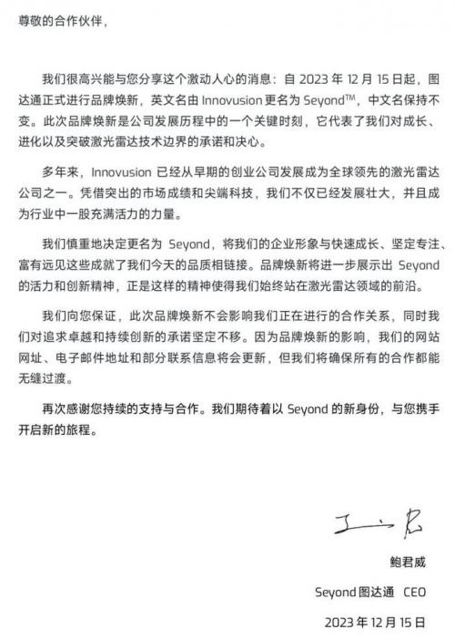 自2023年12月15日起,图达通英文名由Innovusion更名为Seyond,中文名保持不变,一同变更的还有品牌logo。