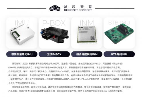 诚芯智联专注于从“定位到感知”国产化道路;在高精度定位领域,致力于提供全域厘米级定位以及高精度航姿服务。在此基础上,公司融合各种传感器,为客户提供全场景感知解决方案,满足智能汽车、机器狗、人形机器人、智慧农业、智慧交通、智慧矿场、码头等领域在智能驾驶方面需求。