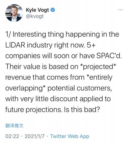 对此,有业界大佬预测,激光雷达行业将出现整合/崩盘,特别是那些已经上市或计划通过与空白支票公司交易上市的公司。今年早些时候,Cruise首席技术官Kyle Vogt在推文中表示,“激光雷达初创企业的潜在市值基于‘期望中的营收’计算而来,而这样的未来营收又是来自高度重叠的潜在收入,并没有给未来预期打什么折扣(以贴合现实情况)。”