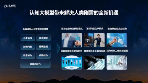 当前大模型可归纳为七大能力。包括语言理解、文本生成、知识问答、逻辑推理、数学、代码和多模态能力。这七大能力将在以下几个方面改变我们的生产和生活方式。首先是信息分发和获取的方式,过去,我们习惯通过搜索来获取某个知识平台的专业知识,现在我们可以直接向机器提出专业问题,无需再进行繁琐的搜索。最近,我们发布了语音大模型,这使得我们与机器的交流变得更加自然逼真。与讯飞星火的交流就像与真人对话一样,你根本无法感受到你是在与一台机器进行交流。