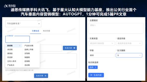 我们与迪思传媒合作,其“文案生成”的能力正是基于我们的技术。通过这个界面,用户可以选择不同文案类型进行生成,无论是讲话稿、新闻稿、促销稿还是其它类型的稿件,都能得到满足。
