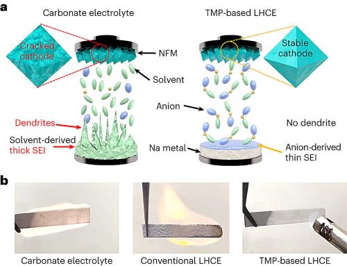 尽管电池火灾很少见,但电池使用量的增加意味着此类事件正在增加。研究人员在电解质中使用了盐基固体稀释剂,以促进充放电循环。一种特定类型的盐——硝酸钠——使研究人员能够在电解质中仅使用一种不可燃的溶剂,从而稳定整个电池。相关研究以发表于期刊《Nature Energy》。