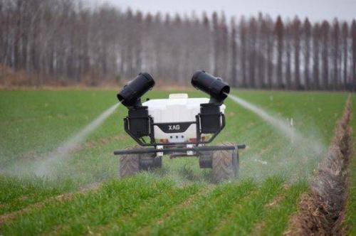 (图二、 19年底,极飞科技发布R80农业无人车,可自动躲避障碍物,进行自动喷洒。)