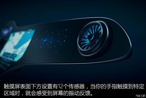 MBUX Hyperscreen整块屏幕设计出了悬浮感,犹如飘在仪表台上一般,很有科技感。另外,空调的出风口的设计灵感来自于涡轮发动机。