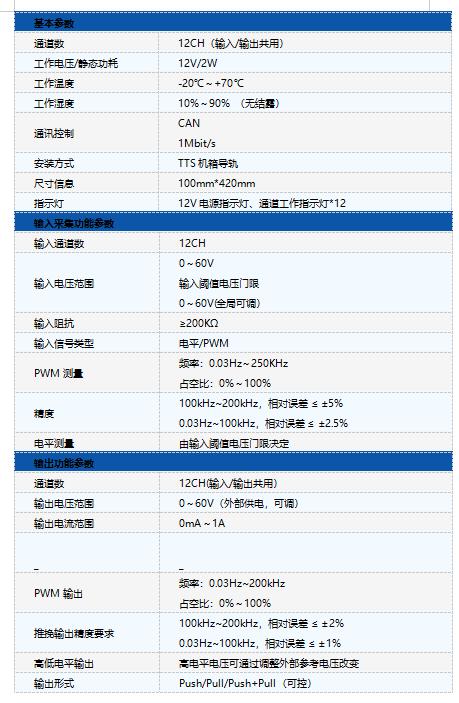 TTS9011是基于TTS机箱的12通道数字输入输出板卡,专用于TTS机箱集成,每个通道都支持高低电平输出与采集、PWM输出与采集,工作在输出模式时还支持输出回采功能。该板卡基于CAN总线报文控制,总线速率为1M bps,支持Window、Linux系统的二次程序开发,API接口使得设备能够方便的集成到其他设备或软件系统中。