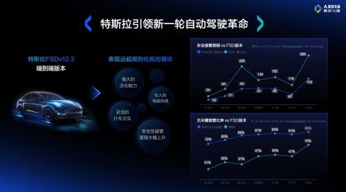 第二张图展示的是对驾驶员从A点到B点的无严重接管成功率,以及完全无接管成功率。可以看到,随着版本的迭代,都在稳步上升;尤其是在V12.3版本中,完全无接管比例快速攀升。从V11版本的47%,攀升到了V12版本的70%,用户体验也大幅上升。