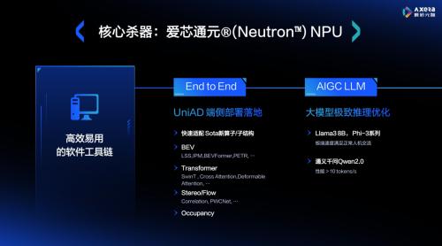 爱芯元智拥有高效易用稳定的软件工具链,在软件层面同时支持端到端和LLM大模型。