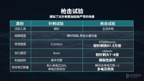 【太平洋汽车技术频道】3月30日,埃安举行了弹匣电池2.0枪击试验发布会,全球首次实现电池整包枪击不起火,首次解决了多电芯瞬时短路、爆裂性破坏等极端环境下的电池安全难题。与国标动力电池安全试验,安全标准最高的车规级针刺实验不同,埃安弹匣电池实现的整包枪击更加严苛,对电池的结构、材料、热失控管理、电池异常管理等等,要求更高、难度也更大。