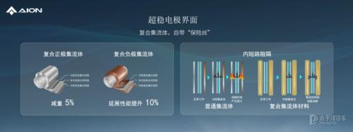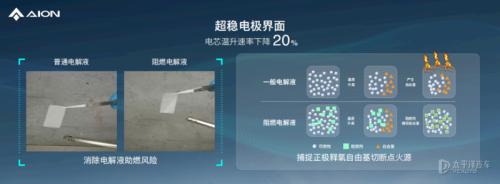 对于锂离子电池而言,电极界面是电芯内活性最高的区域。为了加强电极界面的稳定性,弹匣电池2.0开发出“超稳电极界面”技术。通过具有超高稳定性、超高耐热性的纳米陶瓷材料,大幅增加了电极界面韧性;复合集流体材料的应用,可以在热量聚集时快速坍缩,避免持续短路;同时,埃安还在弹匣电池2.0的电解液中加入了耐氧化阻燃剂,高温激活后,可捕获燃烧反应的自由基,断绝持续燃烧的条件。在三重技术的防护下,电芯即便发生热失控,其升温速率也能降低20%。
