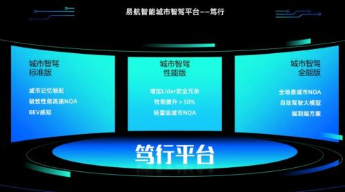 目前,易航智能正在全力推进高智价比NOA方案量产落地。今年上海车展上,易航智能正式发布“笃行”城市智驾平台,采用量产级BEV“灵眸”,包括城市智驾标准版、城市智驾性能版和城市智驾全能版三款系列方案,在场景和性能两方面对此前已经量产的基于轻量级计算平台的高速NOA功能做了进一步的拓展和提升。