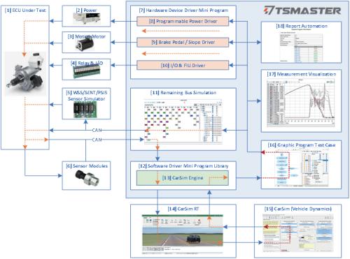 基于TSMaster的HIL仿真测试系统,TSMaster作为唯一的测试软件,包含丰富的API函数,完整的外设集成以及完整的后处理接口等,具有成本低、部署更快、自动化程度高等特点。