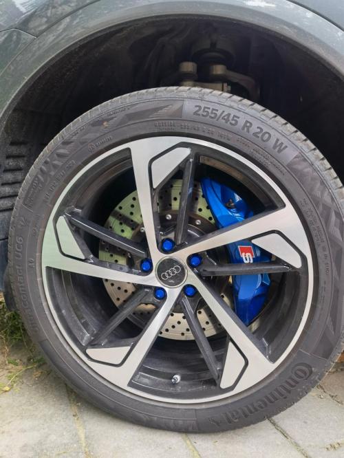 “目前用的是前阿基波罗六活塞卡钳+380打孔盘,后卡钳喷漆换打孔盘。我想着的,既然改了就不要跟原厂的像太多,所以卡钳没有选择常用的红色,而是选择了蓝色(说实话有点后悔没上银色)。”