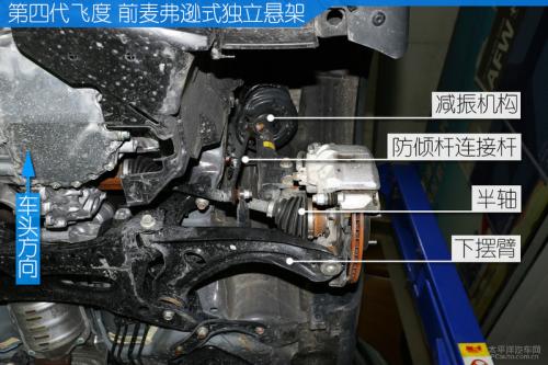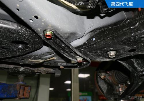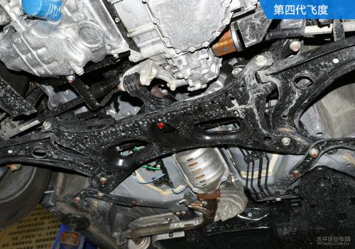 新一代飞度的前副车架跟上代车型一样,都是钢制非全框式的,并且也是通过四个螺栓直接与车身相连。新一代飞度在副车架与车身的连接处并没有使用橡胶衬套,而是直接用螺栓硬链接,这样对于车身安全性来说并没有影响,只是对噪声和振动的隔绝不太有利。