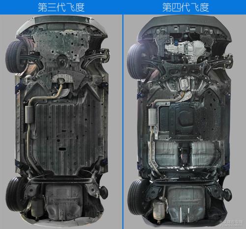 新一代飞度和上一代飞度都是使用前麦弗逊后扭力梁悬架,并且二者在摆臂用料以及悬架布局上都是很接近的,不过二者在护板覆盖方面有不少差异(需要说明的是,两台飞度的全景图都是未拆护板前的状态)。