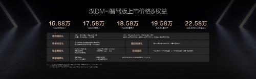 其中王朝网旗舰轿车汉DM-i智驾版推出5款车型,售价16.88万-22.58万元;汉EV智驾版也推出5款车型,售价17.98万-23.58万元,实现加配不加价,开创B+C级轿车全民智驾。