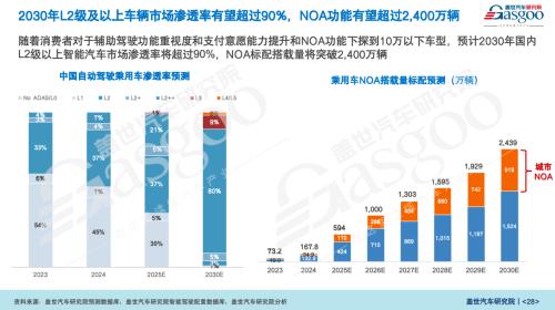 据盖世汽车研究院预测,接下来随着消费者对辅助驾驶功能的重视程度和支付意愿的不断提升,以及NOA功能进一步下探至10万元以下车型,其整体搭载规模将继续大幅提升。其中2025年,NOA新车搭载规模或接近600万辆,高速NOA和城市NOA渗透率分别有望达40%和20%,真正迎来商业化拐点。到2030年,预计国内乘用车L2及以上智能汽车智驾功能标配市场渗透率将超过90%,NOA标配搭载量将达到2400万辆以上。