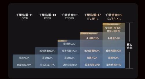据吉利汽车集团CEO淦家阅在发布会上介绍,“千里浩瀚”规划了H1、H3、H5、H7、H9五个不同层级的智驾方案,全面覆盖从高速NOA到城市通勤NOA、全场景D2D再到L3不同场景应用。