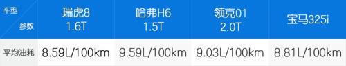 除了加速能力以外,衡量一台发动机是否高效一个很重要的标准便是燃油经济性。我们从小熊油耗(https://www.xiaoxiongyouhao.com)查询到瑞虎8 1.6T、哈弗H6 1.5T以及领克01 2.0T的车主众测油耗分别如下。不难看出,瑞虎8 1.6T车型在燃油经济性方面相对更低排量的哈弗H6和领克01都有一定的优势。