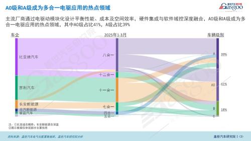 根据盖世汽车研究院数据统计分析,以2025年1-3月的市场表现为样本,揭示了电驱动系统集成化发展的核心趋势——A0级与A级车型正以80%的合计占比,成为多合一电驱技术落地的关键战场。