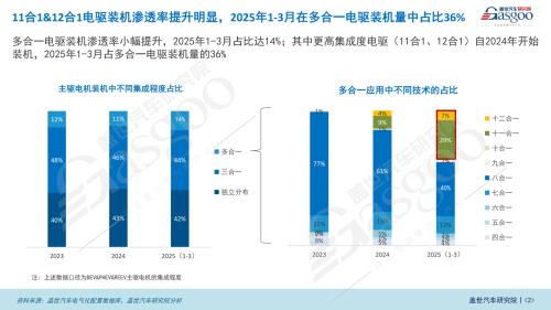 随着电动汽车行业的蓬勃发展,多合一电驱技术逐渐成为行业关注的焦点。根据盖世汽车研究院数据统计分析,多合一电驱装机渗透率在2025年1—3月有了小幅提升,占比达14%。更高集成度电驱(11合1、12合1)自2024年开始装机后,在2025年1—3月已占多合一电驱装机量的36%。