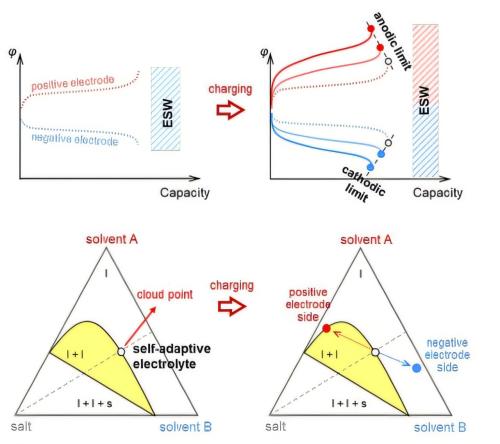 新设计的电解质灵感源自所谓的“盐析”效应,该效应源于相平衡理论。这是一种相分离现象,当向溶液中添加盐时,某些成分的溶解度会降低(即从溶液中分离出来)。“有趣的是,电池的充电过程会在电解质中产生盐浓度梯度,这为这种效应的发生提供了必要条件,”Zhao教授解释说。“基于这一理念,我们开发了一种电解质系统,利用这种浓度驱动的相行为,自适应地扩展其在运行过程中的稳定窗口。”