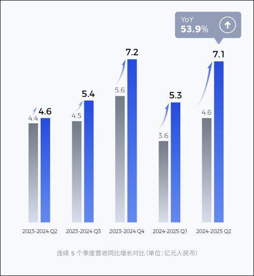 本季度,禾赛持续保持行业领先地位,实现营收7.1亿元人民币,同比增长53.9%,单季营收实现连续5个季度同比增长,稳居行业领先地位。