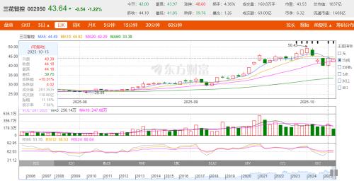 受此消息影响,15日下午三花智控A股和港股双双大涨。其中A股午后直线拉升至涨停,收报44.18元/股,涨幅10.01%,总市值达1860亿元;港股同步上涨,盘中一度涨超13%,最终收盘价为39.52港元/股,涨12.98%,总市值1646.31亿港元。