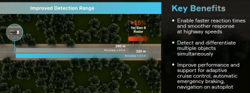 - 通道数量增加:第八代雷达的基础配置使通道数量比上一代产品增加了一倍,从而增强了探测和物体分类的灵敏度,同时以最小的设计变更灵活地提供卓越的雷达性能。