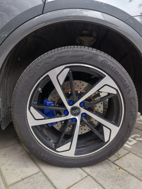 “目前用的是前阿基波罗六活塞卡钳+380打孔盘,后卡钳喷漆换打孔盘。我想着的,既然改了就不要跟原厂的像太多,所以卡钳没有选择常用的红色,而是选择了蓝色(说实话有点后悔没上银色)。”