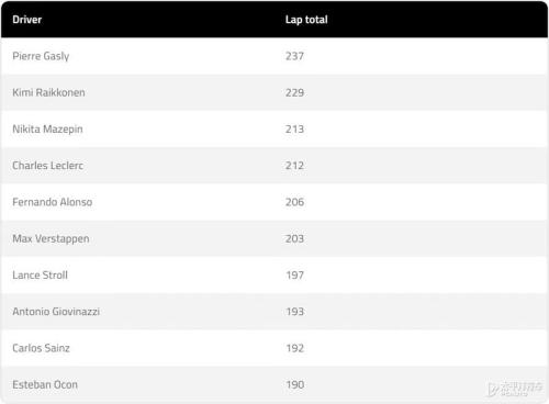 测试里程最长的前10位车手(单位:圈)