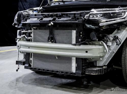 荣威iMAX8拥有Shotgun前端结构专利技术(前翼子板内侧用于吸能的上边梁),其环抱式结构和内部的加强板能够引导车辆进行Y向运动,加上全框式副车架前端外拓,承载与吸能效果的提升,形成了新型前舱笼式框架结构。