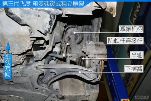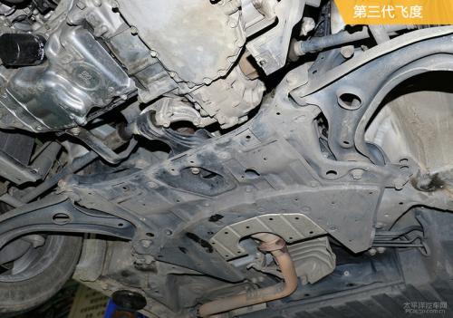 新一代飞度的前副车架跟上代车型一样,都是钢制非全框式的,并且也是通过四个螺栓直接与车身相连。新一代飞度在副车架与车身的连接处并没有使用橡胶衬套,而是直接用螺栓硬链接,这样对于车身安全性来说并没有影响,只是对噪声和振动的隔绝不太有利。
