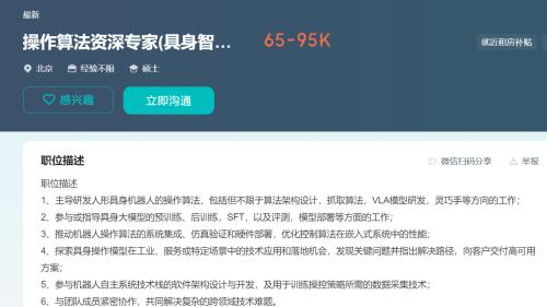 根据招聘信息,“操作算法资深专家”职位描述:主导研发人形具身机器人的操作算法,包括但不限于算法架构设计,抓取算法,VLA模型研发,灵巧手等方向的工作;参与或指导具身大模型的预训练、后训练SFT,以及评测,模型部署等方面的工作;推动机器人操作算法的系统集成、仿真验证和硬件部署,优化控制算法在嵌入式系统中的性能;探索具身操作模型在工业、服务或特定场景中的技术应用和落地机会,发现关键问题并指出解决路径,向客户交付高可用方案;参与机器人自主系统技术栈的软件架构设计与开发,及用于训练操控策略所需的数据采集技术;与团队成员紧密协作,共同解决复杂的跨领域技术难题。