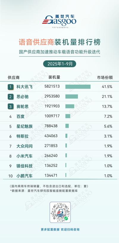 1-9月,车载语音市场呈现国产主导的格局。科大讯飞以41.5%的市场份额和超582万套的装机量稳居第一,凭借技术积淀与生态整合能力构筑起显著的头部优势;思必驰以21.1%的市场份额紧随其后,二者合计占据超62%的市场份额,头部集中效应极为突出。赛轮思、百度、星纪魅族在5%-14%的份额区间展开竞争,展现出车载语音领域技术路线与生态资源的多元博弈;特斯拉、小米汽车、小鹏汽车等车企自研或外资品牌份额普遍低于5%,中小参与者多聚焦细分场景。整体来看,技术迭代速度与场景化适配能力成为核心竞争力,国产替代趋势稳固,行业正处于头部固化与差异化创新并存的发展阶段,国产供应商持续引领市场增长。