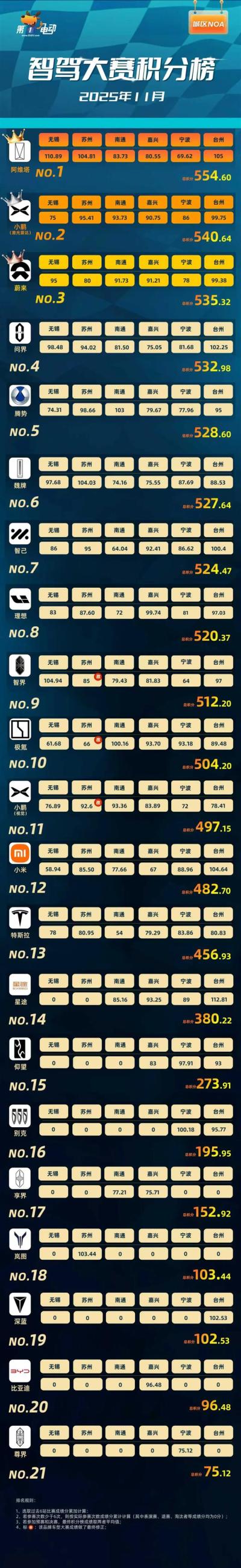 小鹏(激光雷达方案)无锡站(75分)、宁波站(86分)表现欠佳,剔除南京站(106.88分)、常州站(106.42分)的高分后,积分较9月下滑27.55分。不过台州站赛事中(预赛101.5分、决赛98分)的稳定表现支撑其保持亚军位置。