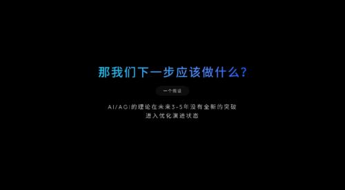 下一步我们应该做什么呢?这个其实也是我们自己未来一两年要做的事情,还是回到刚才那个基本假设,就是我们认为AI和AGI的基础理论在未来三到五年可能不会有全新的突破,可能是进入一个演进和优化的阶段,这是一个大的前提。有几件事情还是可以做的。
