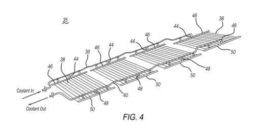 该专利描述了一种电动汽车电池,其外观对于电动汽车爱好者来说并不陌生,但在这些熟悉的部件周围却隐藏着一些关键的不同之处。这些不同之处包括:一个装满阻燃化学物质的囊袋:它位于电池单元附近,通常位于电池单元和电池组顶部之间。该囊袋由柔性聚合物制成,因此可以在需要时刺破。两组刀片:第一组刀片对准囊袋,准备刺破囊袋并释放阻燃化学物质;第二组刀片则对准冷却液入口管路、出口管路或散热器上的特定点,刺破这些部件并将冷却泡沫直接释放到所需位置。特殊的冷却液管路部分:设计有小型密封孔,这些孔用柔软的塞子材料封闭,这种材料易于刀片刺破,但又足够坚固,可以在正常运行期间保持压力。