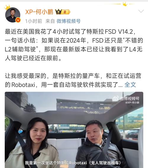 在试驾完特斯拉FSD V14.2版本后,小鹏汽车董事长何小鹏直言:“2026年全自动驾驶会真正到来”。12月30日,何小鹏在其微博账号发布长文,分享了近日在美国历时4小时深度体验特斯拉FSD V14.2版本后的震撼感受。